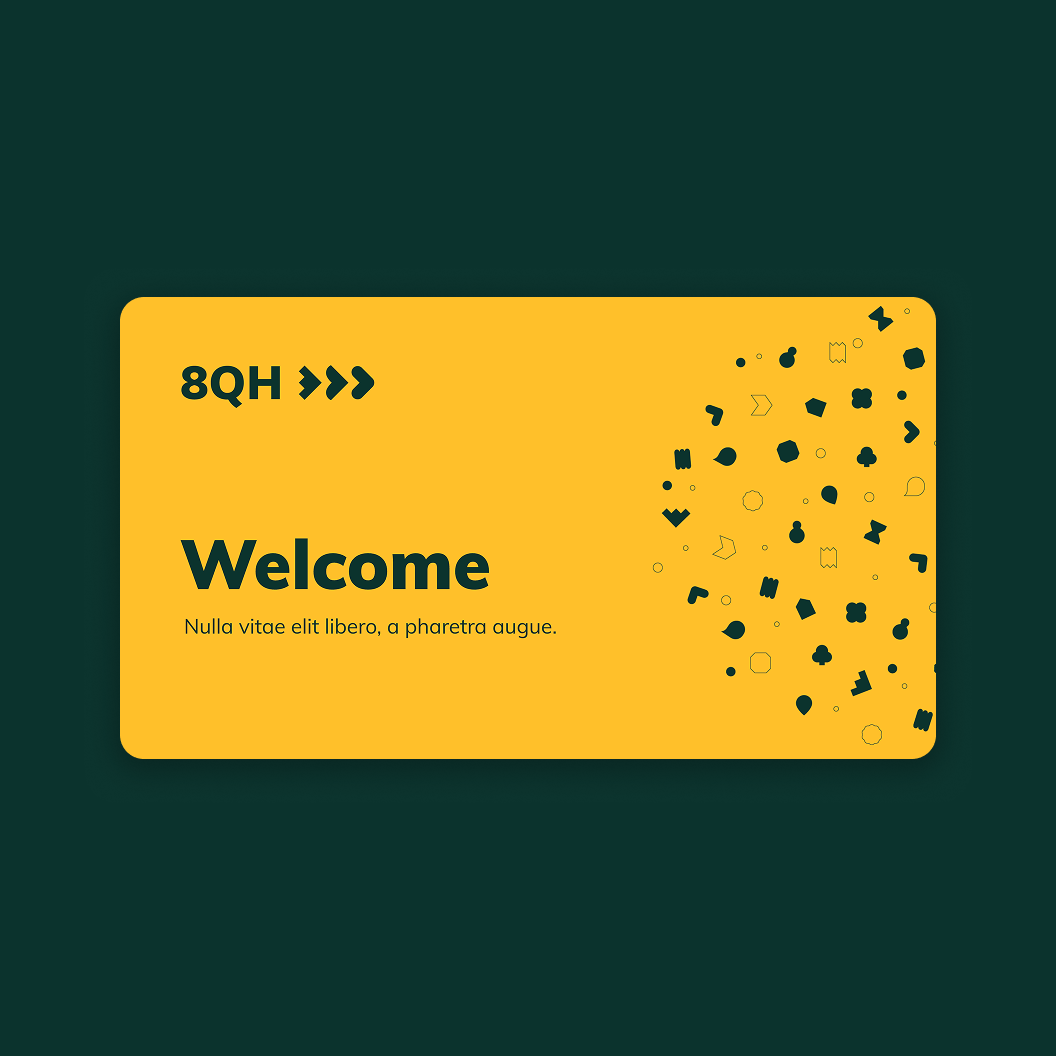 The 8QH branding is focused around the concept of idea-interchange, acceleration and inclusion. The fast forward logo concept is constructed using various chevron-like icons. The icon library is expanded upon in the broader application of the brand, visually representing intermingling of ideas.