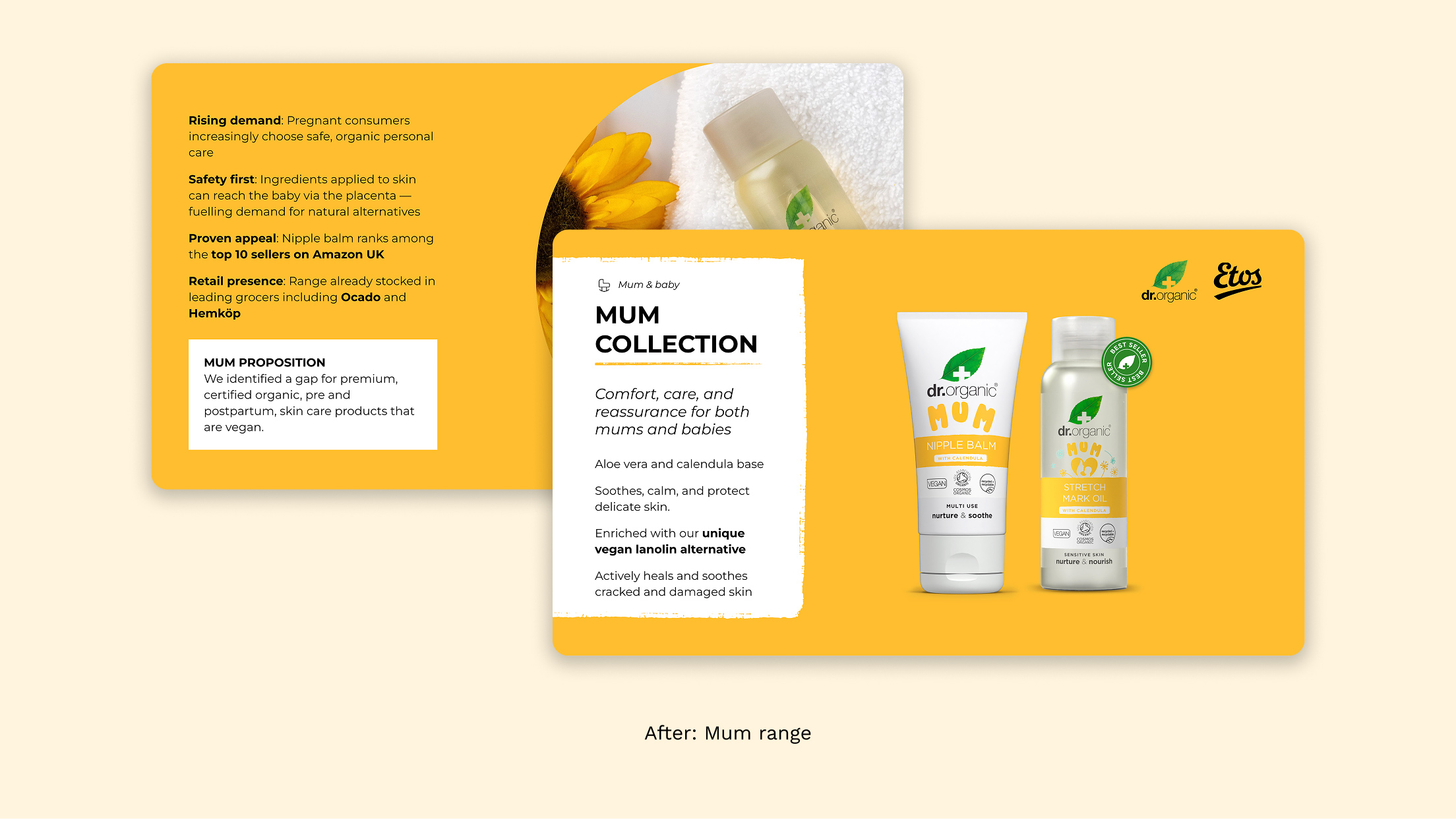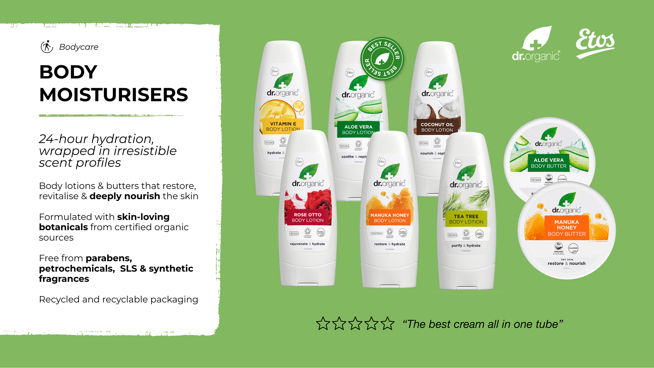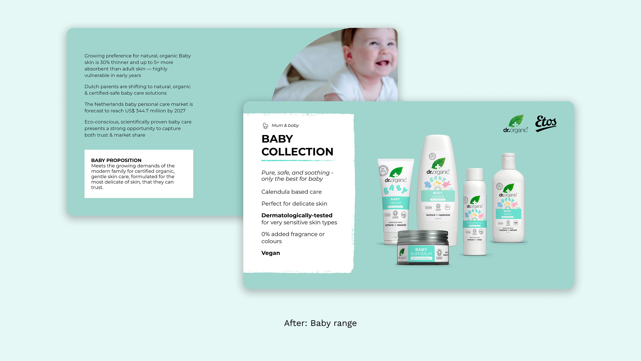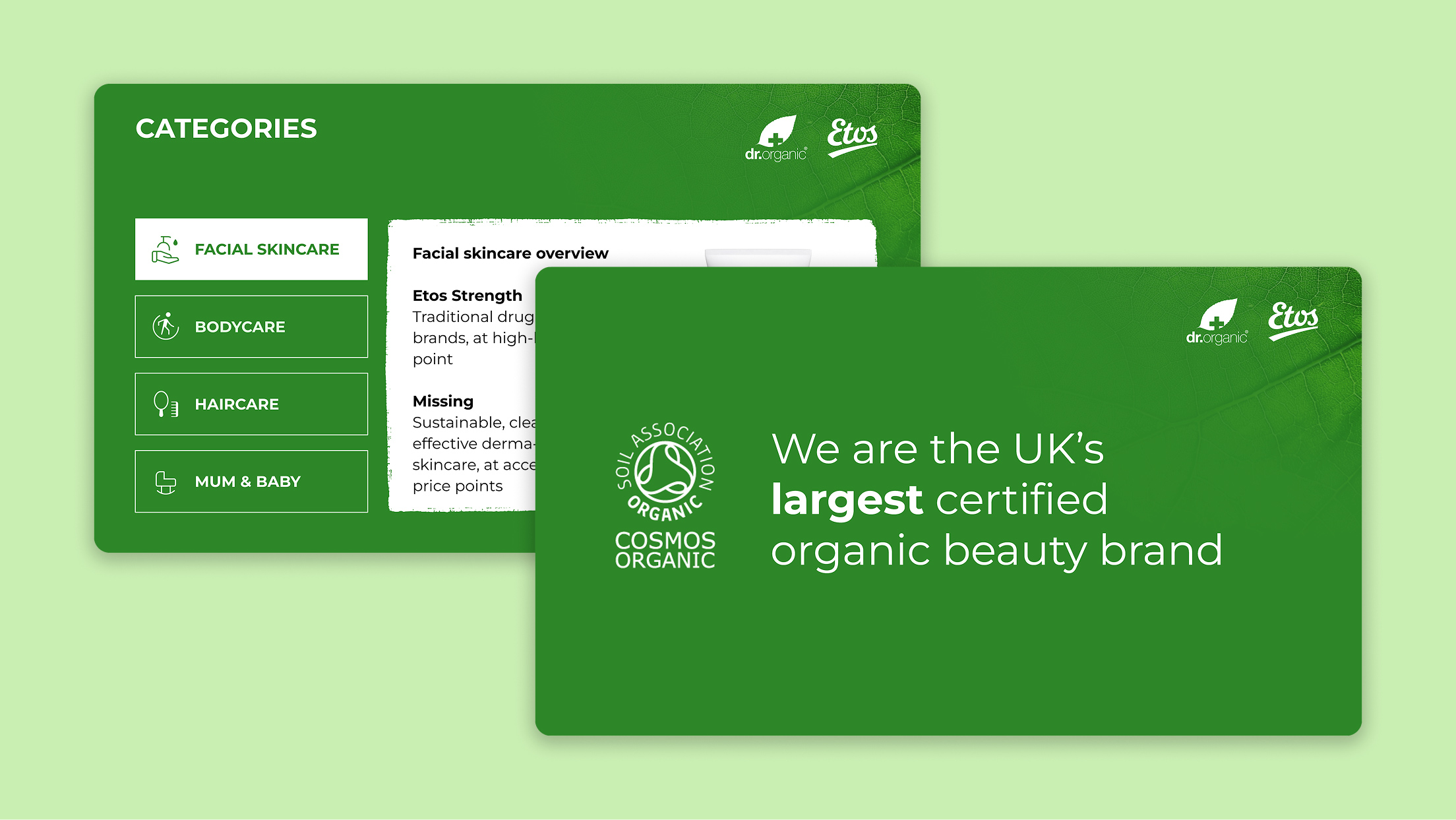 Dr Organic needed to pitch to Etos, a retailer partnership that represented a six-figure opportunity. Their existing presentations, however, were outdated, cluttered, and lacked a clear narrative. They needed a pitch that felt modern, confident, and aligned with their brand values.