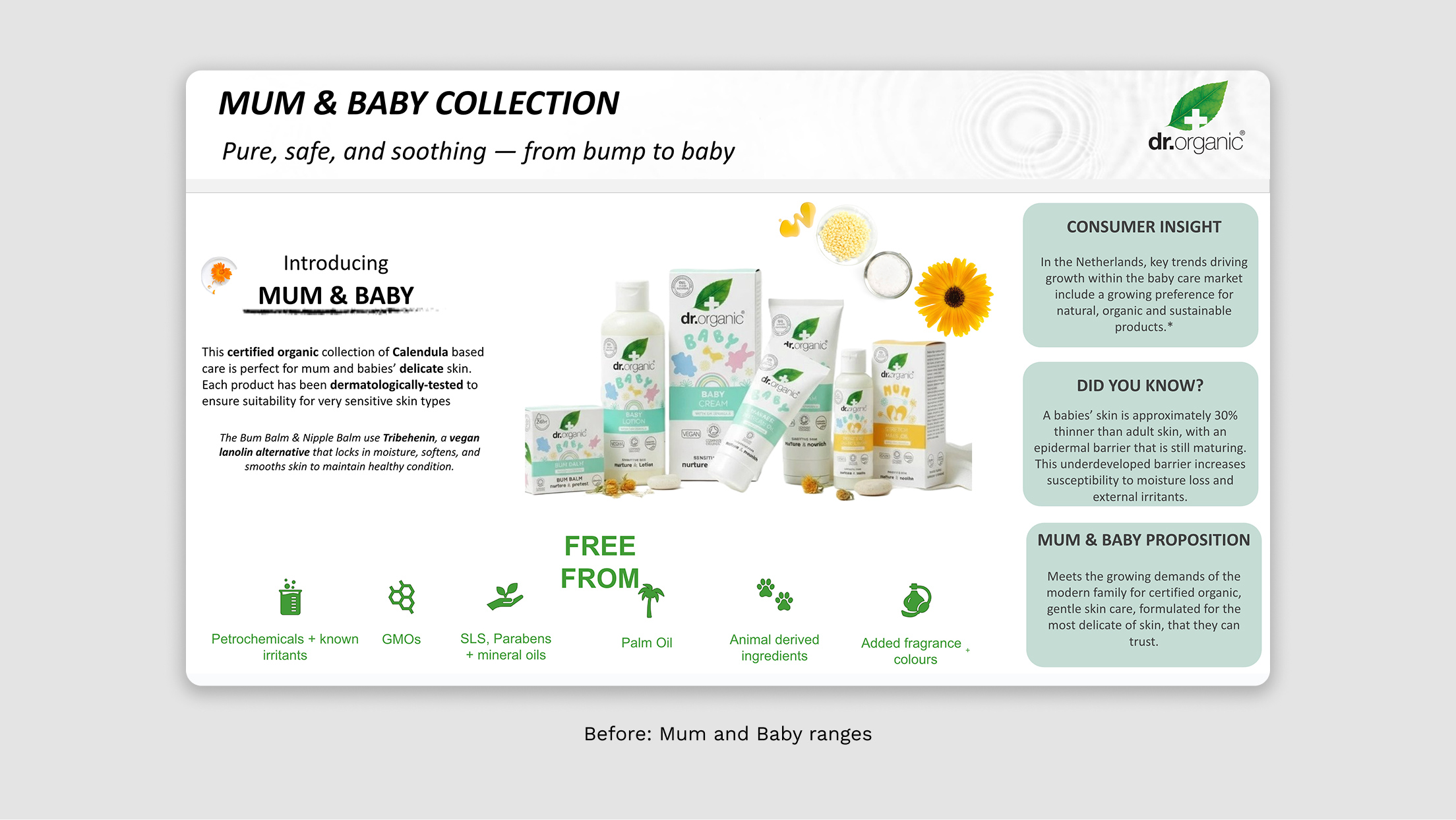 To fully express the Dr Organic narrative, significant layout changes were made. Visual clutter was removed, unclear sections were rewritten or simplified, and dense content was broken across multiple slides for better pacing and comprehension.