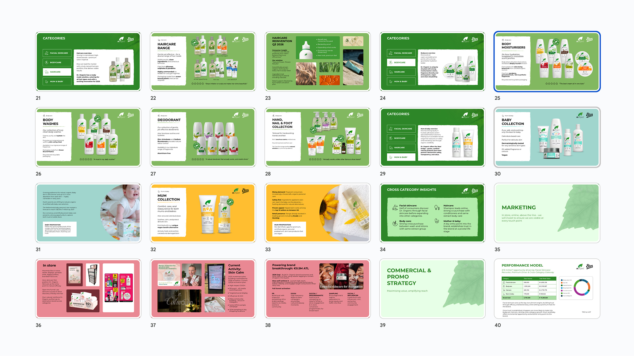 Working closely with the Dr Organic team, I restructured the presentation from the ground up. Together we refined the story, clarified the messaging, and built a layout system that communicated with clarity and elegance. The goal was to present the brand as they see themselves: credible, organised, and strategically focused.
